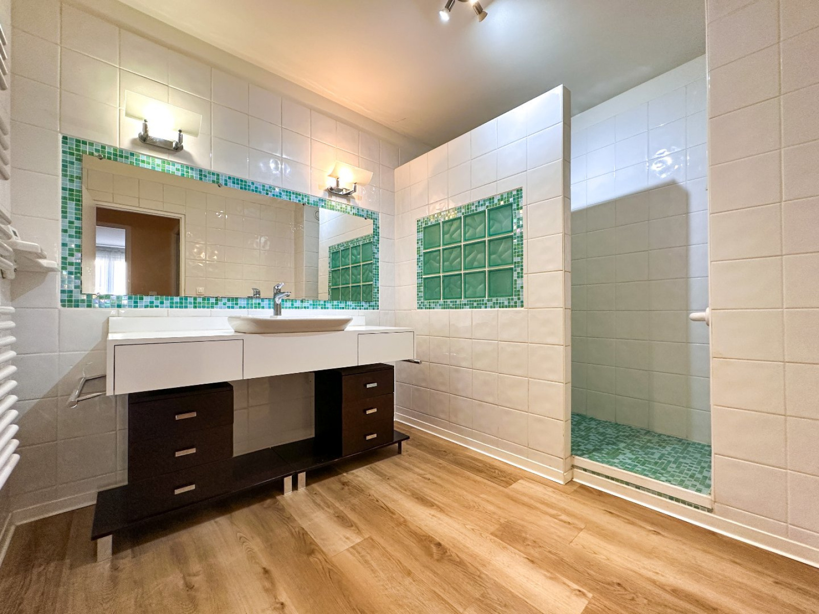 L'appartement dispose d'une grande salle de bains avec douche.