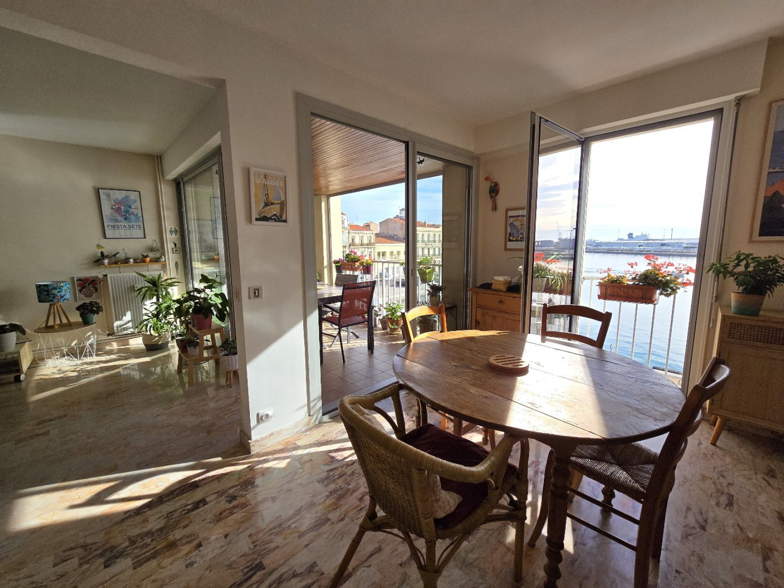 Côté Quai d'Alger, Au sein d'une copropriété bien entretenue, venez découvrir cet appartement T5 bis traversant d'une superficie de 107 m² loi Carrez situé au troisième étage avec ascenseur. L'entrée avec placards et dressing mène à une spacieuse pièce de vie de 40m² très lumineuse exposée EST ouvrant sur une terrasse, mais également une grande suite parentale avec de même une vue imprenable sur le port, la mer et les canaux. Côté OUEST, vous trouverez une grande cuisine équipée donnant sur un balcon, deux spacieuses chambres, une salle d?eau moderne avec douche à l?italienne, et un wc séparé Les avantages de cet appartement comprennent : Un emplacement de stationnement couvert, un cellier, un local vélo commun. Sa proximité immédiate des commerces, des halles de Sète, du cadre royal, des transports (bus, piste cyclable, gare ?) Rare sur le marché sétois !