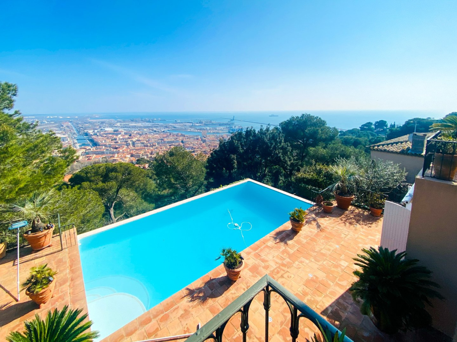Exclusivité en inter-agence Côté Saint Clair, Villa d?architecture de charme entre bastide et provence dont les volumes offrent un art de vie élégant et confortable. 3 suites avec chacunes leur dressing et douche WC dont la parentale de plus de 35m², sublime salle de bains marbre. De grandes baies ouvrent les espaces de vie entre terrasses, pots d?anduze, piscine et la vue mer. L?arrivée se fait au niveau du salon séjour de plus de 75m², les sols en terres cuites salerne sont conçues pour la maison. Portes en Frake, Plafonds 360, chauffage sols. Une grande cuisine provençale pour aussi recevoir, mêlant portes anciennes et faïences du sud, prolongée par la pergola de glycine côté mer sud. Piscine à débordement offrant la plus belle vue de Sète... Accès voitures très facile. Bien faisant l?objet d?une délégation de mandat.